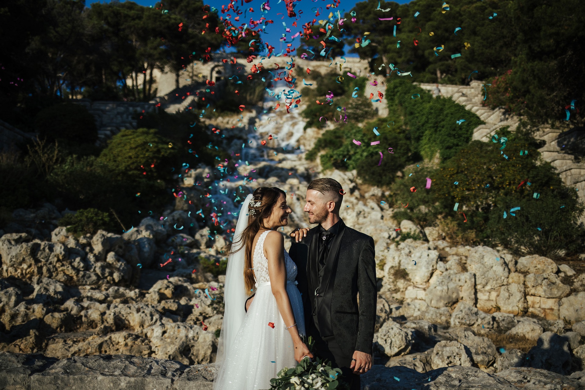 Edoardo in total black e la bellissima Cinzia hanno scelto di immortalare il loro giorno più importante percorrendo gran parte del Salento, terminando il tour nella splendida location di Villa Zaira.